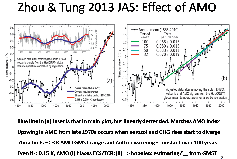 The AMO index smoothed pattern is shown by the red curve in the inset at the top of the LH panel of Slide 7, and can be seen to resemble the detrended GMST with shorter term natural signals removed (blue curve). The RH panel is not relevant to my argument, and can be ignored. Zhou and Tung may be overestimating the influence of the AMO on GMST (their range is in fact over 0.4 K, not 0.3 K as per the slide); Delsole et al (2011) estimate it to be about half as strong. However, even at one-quarter of the level shown it is enough to bias estimation of ΔFaero up by a factor of two or more, with an accompanying upwards bias of 20% or more in the estimate of warming attributable to GHG (and hence in TCR estimates; ECS estimates are even worse affected).