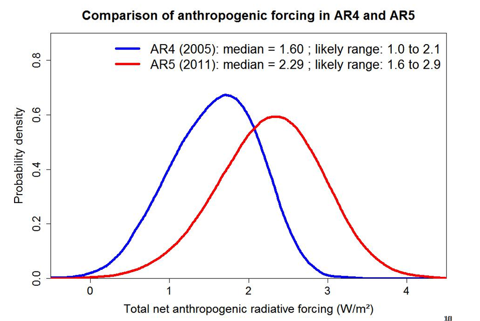 I will illustrate the effect of using a uniform prior for TCR estimation, that being a simpler case than ECS estimation. Slide 10 shows estimated distributions from AR4 and AR5 for anthropogenic forcing, up to respectively 2005 and 2011. These are Bayesian posterior PDFs. They are derived by sampling from estimated uncertainty distributions for each forcing component, and I will assume for the present purposes that they can be considered to be objective.