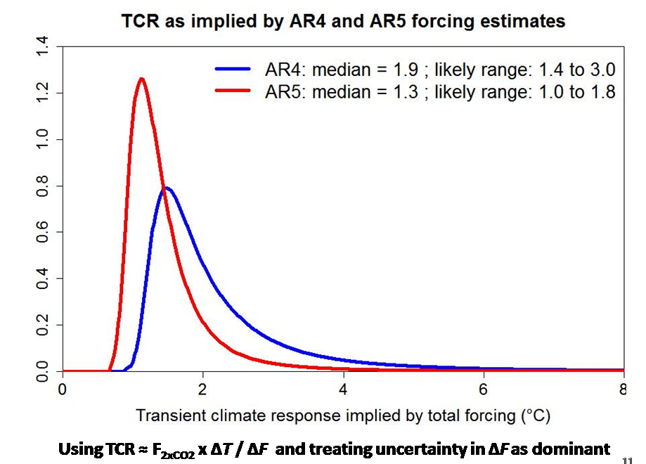 Slide 11 shows posterior PDFs for TCR derived from the AR4 and AR5 PDFs for anthropogenic forcing, ΔF, by making certain simplifying approximations. I have assumed that the generic-TCR formula given in AR5 holds; that uncertainty in the GMST rise attributable to anthropogenic forcing, ΔT , and in F2xCO2, the forcing from a doubling of CO2, is sufficiently small relative to uncertainty in ΔF to be ignored; and that in both cases ΔT = 0.8°C and F2xCO2 = 3.71 W/m2.