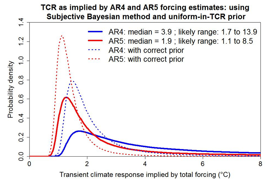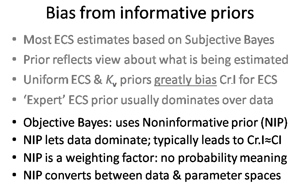 Almost all the PDFs for ECS presented in AR4 and AR5 used a ‘subjective Bayesian’ approach, under which the prior is selected to represent the investigator’s views as to how likely it is the parameter has each possible value. A judgemental or elicited ‘expert prior’ that typically has a peaked distribution indicating a most likely value may be used. Or the prior may be a diffuse, typically uniform, distribution spread over a wide range, intended to convey ignorance and/or with a view to letting the data dominate the posterior PDF. Unfortunately, the fact that a prior is diffuse does not in fact mean that it conveys ignorance or lets the data dominate parameter inference.