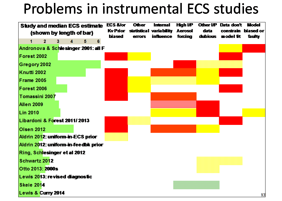 The ‘Model biased or faulty’ red rectangle for Andronova and Schlesinger (2001) reflects a simple coding error that appears to have significantly biased up its ECS estimation: see Table 3 in Ring et al (2012).