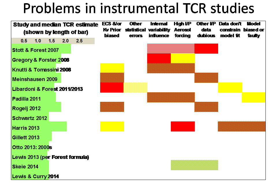 To summarise: all pre-2012 instrumental-period-warming studies had one or more serious problems, and their median ECS estimates varied widely. Most studies from 2012 on do not appear to have serious problems, and their estimates agree quite closely. (The Schwartz 2012 study’s estimate was a composite of five estimates based on different forcing series, the highest ECS estimate comes from a poor quality regression obtained from one of the series.)