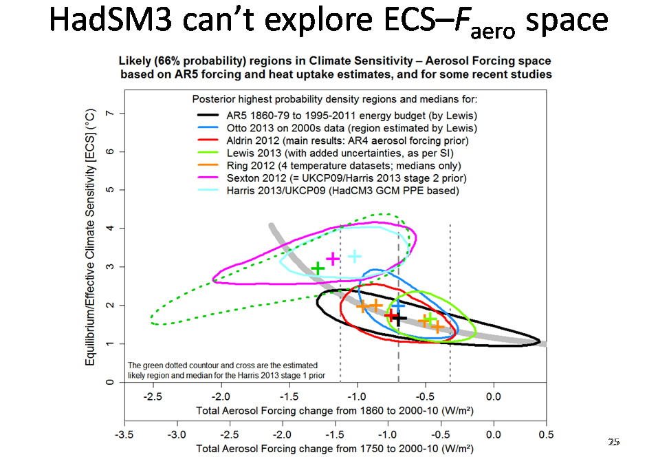 The median estimates from the studies not using GCMs cluster around the thick grey curve, and their likely regions are orientated along it: under an energy budget or similar model, high ECS estimates are associated with strongly negative aerosol forcing estimates. But the likely regions for the Harris study are orientated very differently, with less negative aerosol forcing being associated with higher, not lower, ECS. Its estimated prior distribution ‘likely’ region (dotted green contour) barely overlaps the posterior regions of the other studies: the study simply does not explore the region of low to moderately negative aerosol forcing, low to moderate ECS which the other studies indicate observations best support. It appears that the HadCM3/SM3 model has structural rigidities that make it unable to explore this region no matter how its key parameters are varied. So it is unsurprising that the Harris et al (2013) estimates for ECS, and hence also for TCR, are high: they cannot be regarded as genuinely observationally-based.