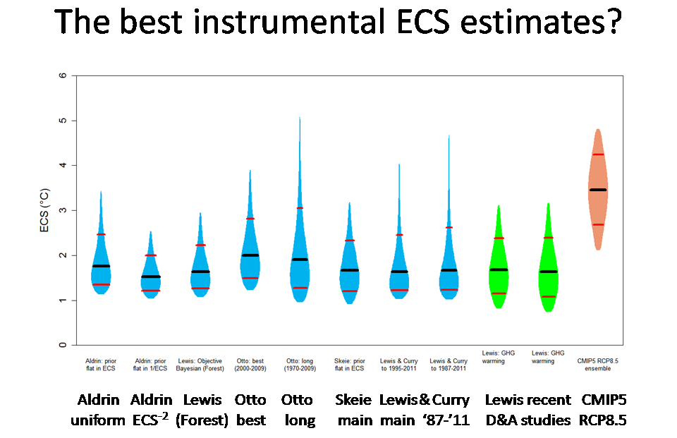 The ‘Aldrin ECS-2‘ violin is for its estimate that uses a uniform prior for 1/ECS, which equates to a ECS-2 prior for ECS. I believe that to be much closer to a noninformative prior than is the uniform-in-ECS prior used for the main Aldrin et al (2012) results. The Lewis (Forest) estimate is based on the Lewis (2013) preferred main ECS estimate with added non-aerosol forcing uncertainty, as shown in the study’s supplemental information.