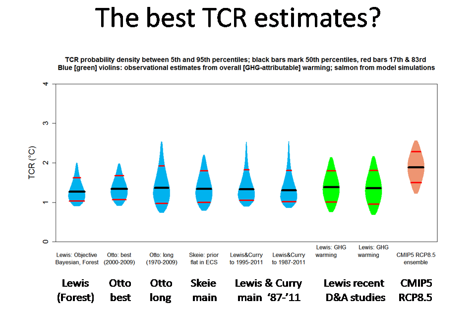 This slide shows what I regard as the least-flawed ECS estimates based on observed warming over the instrumental period, and compares them with ECS values exhibited by the RCP8.5 simulation ensemble of CMIP5 models. I should arguably have included the Schwartz (2012) and Masters (2014) estimates, but I have some concerns about the GCM-derived forcing estimates they use.