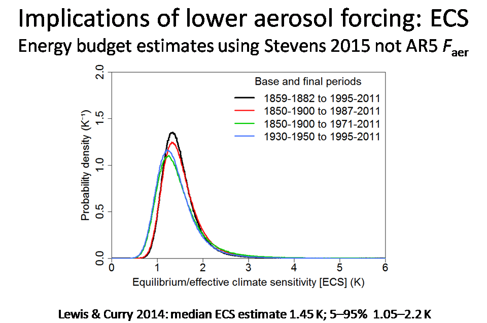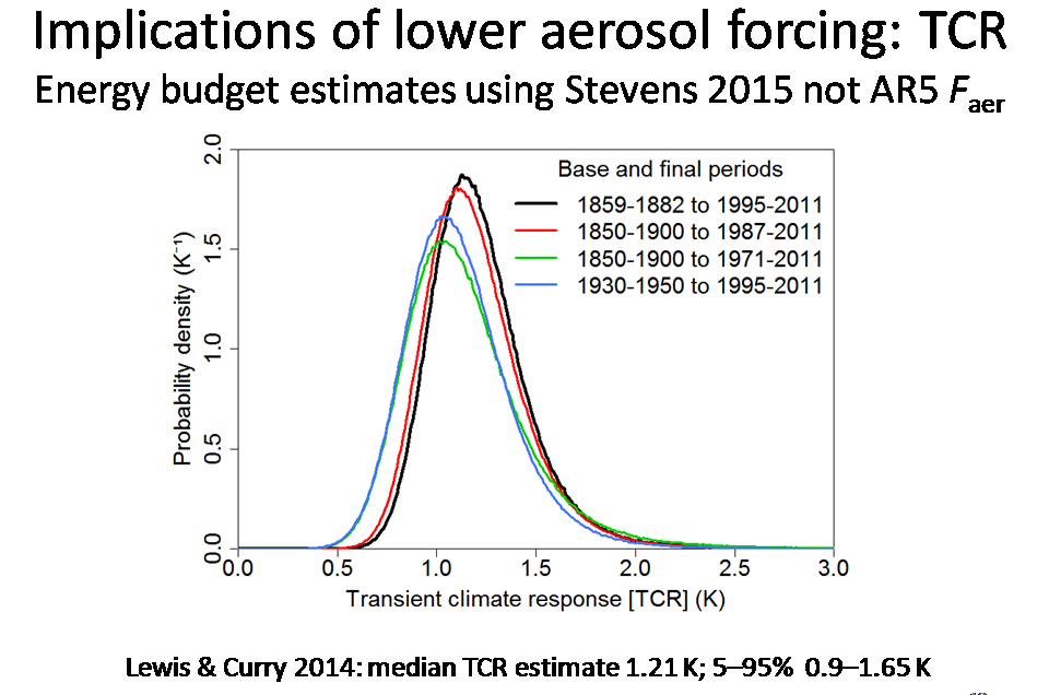 The main cause of long tails in ECS and TCR studies based on observed multidecadal warming is uncertainty as to the strength of aerosol forcing (Faer). I’ll end this part with a pair of slides that show how well constrained the Lewis and Curry (2014) energy-budget main ECS and TCR estimates would be if they were recalculated using the distribution for aerosol forcing implicit in Bjorn Stevens’ recent study instead of the wide AR5 aerosol forcing distribution. (For some reason these slides appear much later, out of order, in the PDF version of my slides on the Ringberg 2015 website.)