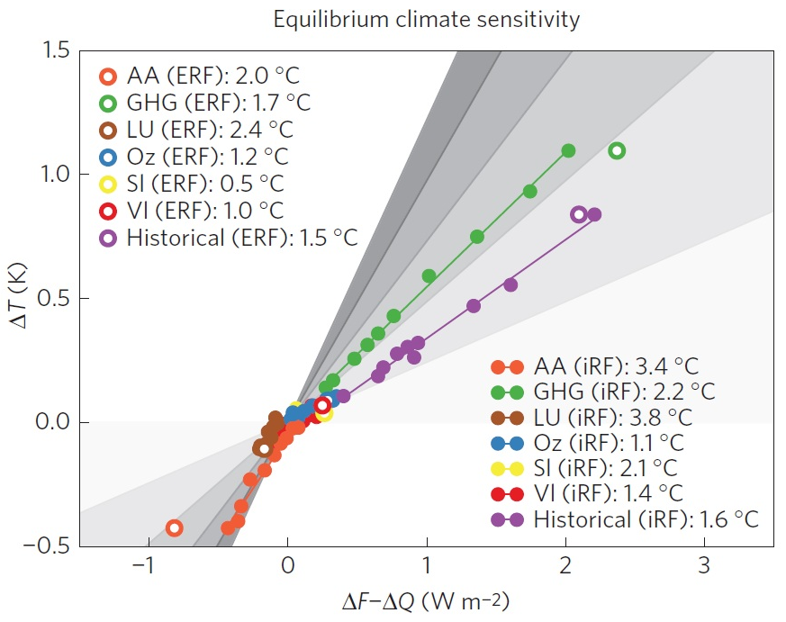 Section 8.1 of AR5[4] gives a useful introduction to radiative forcing in its different variants. It defines ERF similarly to Hansen’s Fs, but with no adjustment made for the change in land temperature (which is modest when SST is fixed), and notes that ERF can also be estimated by regression, as for Fs*. The ERF, Fs and Fs* measures allow for the troposphere to adjust to the imposed forcing, as well as the stratosphere.