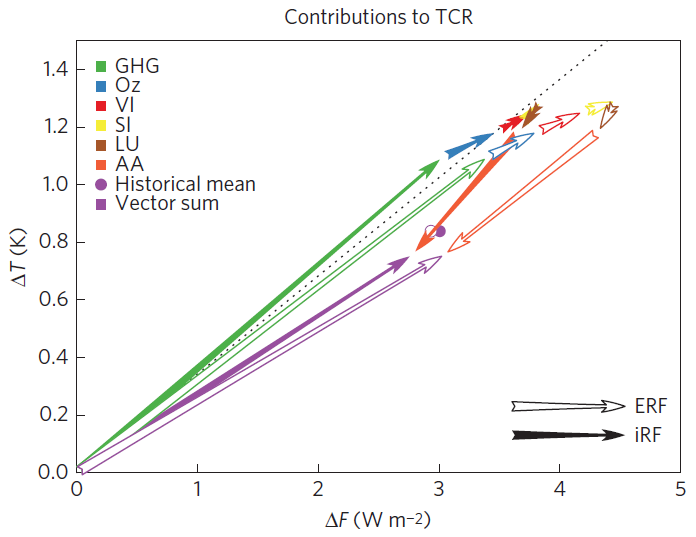 The findings using iRF are largely irrelevant because iRF is little used in observational studies, which generally use ERF and/or RF values.[12] It is therefore of little significance what efficacy, TCR and ECS estimates based on iRF values are. Marvel et al. seem to think that the IPCC AR5 RF values are iRFs, supporting their assertion that there is some ambiguity in the IPCC AR5 forcing definitions by writing: ‘For example, the best-estimate 1750–2011 iRF and ERF values given by the IPCC are identical, except for aerosols’. However, it is clear that the IPCC used RF, not iRF, values: there is no ambiguity on that point.[13] Hansen 2005 found that iRF was 56% higher than RF for ozone, 10% higher for CO2, and 5% higher for GHG and aerosols. Moreover, it is well known that, where they differ, ERF is a more appropriate measure than RF of the effect of forcings on GMST.[14] In particular, use of RF (or, a fortiori, iRF) for indirect aerosol forcing [giving RFaci] is inappropriate.[15] All three observational studies examined in Marvel et al. used ERF as a measure of aerosol forcing. Otto et al. and Lewis and Curry used ERF for non-aerosol forcings as well. None of the studies appear to have used iRF for any forcing.