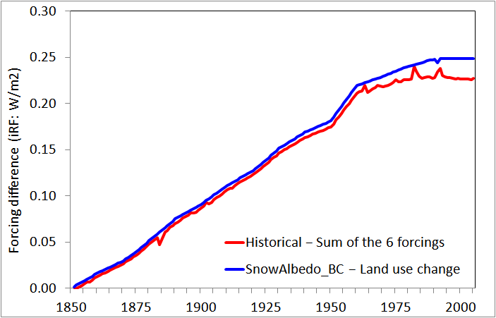 As Figure 4 shows, the difference between Historical iRF and the sum of the six separate forcings closely matches, within 0.02 W/m2 in every year, SnowAlbedo_BC iRF (understood to be included in the Historical simulations) minus LU iRF. So, the difference might conceivably be due to LU iRF being missing from the Historical iRF values. If so, that would depress the efficacy estimates for Historical iRF.