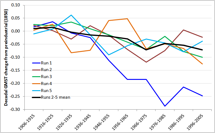 It appears that the very high (although not statistically significant) best estimates for LU efficacy are affected by an outlier, possibly rogue, simulation run. As Figure 5 shows, run 1 produced a far higher GMST response from the middle of the 20th century on. One might expect this if simulated irrigation effects were included, but they should not have been. The difference from the ensemble mean is over four times as large as for any of the other 35 simulation runs.[22] The LU efficacies estimates are greatly reduced if run 1 is excluded. Moreover, AR5’s conclusion about the effects of land-use change imply a median estimate for LU efficacy of zero.[23]