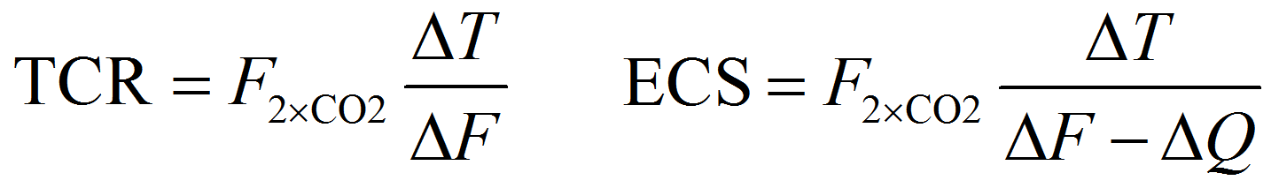 Specifically, the relationships between decadal means of ΔT and ΔF (for TCR) or ΔF − ΔQ (for ECS) in each forced simulation are used to produce separate estimates of GISS-E2-R’s TCR and ECS for each forcing agent, according to the energy budget equations:[5]