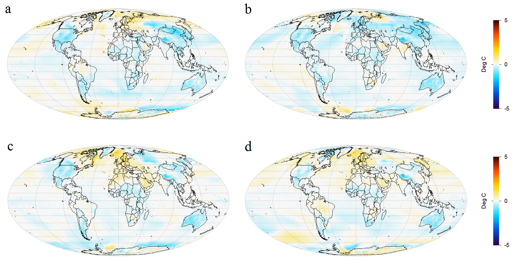 Figure 2 shows the changes simulated by GISS-E2-R in response to LU forcing for each of simulation runs 2 to 5. They compare mean temperatures over 1976–2000 with those over 1850–75. Note that longitudes in these world maps are centred on Greenwich rather than the Pacific.