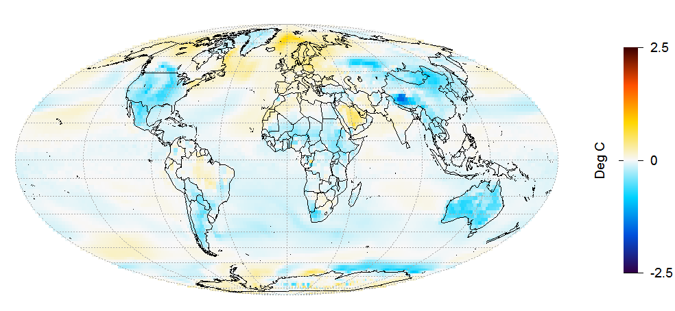 As the forcing and resulting temperature changes are small, internal variability has a significant effect on simulated changes even when comparing 25 year means, with changes varying in sign over some land areas and most of the ocean. Figure 3, which shows the average of all the plots in Figure 2, confirms that temperature changes are small everywhere. Globally averaged, there is a cooling of 0.04°C. Note that the temperature scale has been halved in Figure 3; taking the average of four runs halves variability.