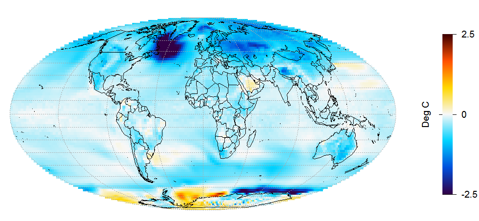 You wrote: “In other words, we are removing the variations due to external forcing from the sun, a forcing whose changes are predictable years into the future.” The warmest part of the year (in absolute terms) is when the Earth is furthest from the Sun, not closest, so the annual temperate cycle is a bit more complicated than changing intensity of solar radiation over the year. The annual temperature cycle appears to have more to do with most of the land area (with lower heat capacity) being in the northern hemisphere.