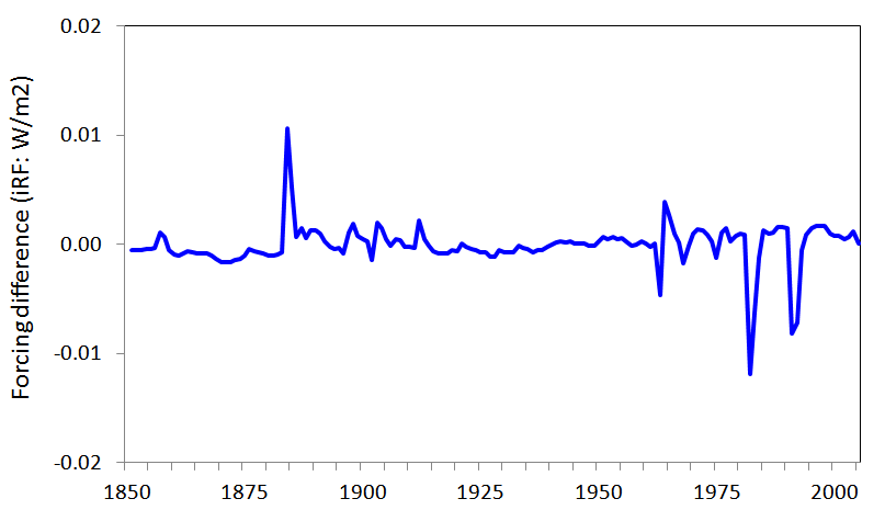 The only substantive response to date from the authors of Marvel et al. to my original article, other than regarding LU run 1, has been a comment at RealClimate by Gavin Schmidt, stating that my observation that their plotted iRF values (both for volcanoes and historical forcing) appear to be shifted by +0.29 W/m2 from the data values was misplaced, since they had used 1850–59 mean forcings as a baseline. There was no mention anywhere in Marvel et al. that this had been done. The difference is negligible except for volcanic (and hence also Historical) forcing: all other individual forcings varied very little during the 1850s from their value in 1850, the baseline year used for the data values.