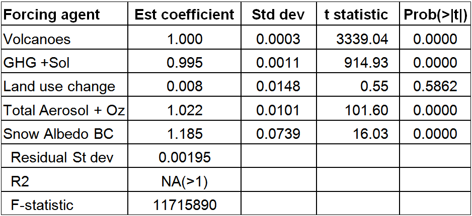 Regressing against so many variables, most of which are highly collinear, can give misleading results. I therefore reduced the number of variables to five by dropping the tiny Orbital forcing and aggregating some other forcings. The results (Table 2) show almost as low a residual standard deviation as before, and an even smaller coefficient on Land use change forcing. Dropping LU forcing as a regressor does not increase the residual standard deviation of 0.00195, but brings the estimated coefficients for Aerosol + Ozone and for Snow Albedo BC down to somewhat closer to one. Adding a very small amount (< 0.004 W/m2) of random noise to the annual Historical forcing values also affects those two coefficients, making them fluctuate around one without significantly affecting the remaining coefficients. If I aggregate all non-LU forcings together and just regress on that and LU forcing, the residual standard deviation goes up but the coefficient on LU remains almost zero.