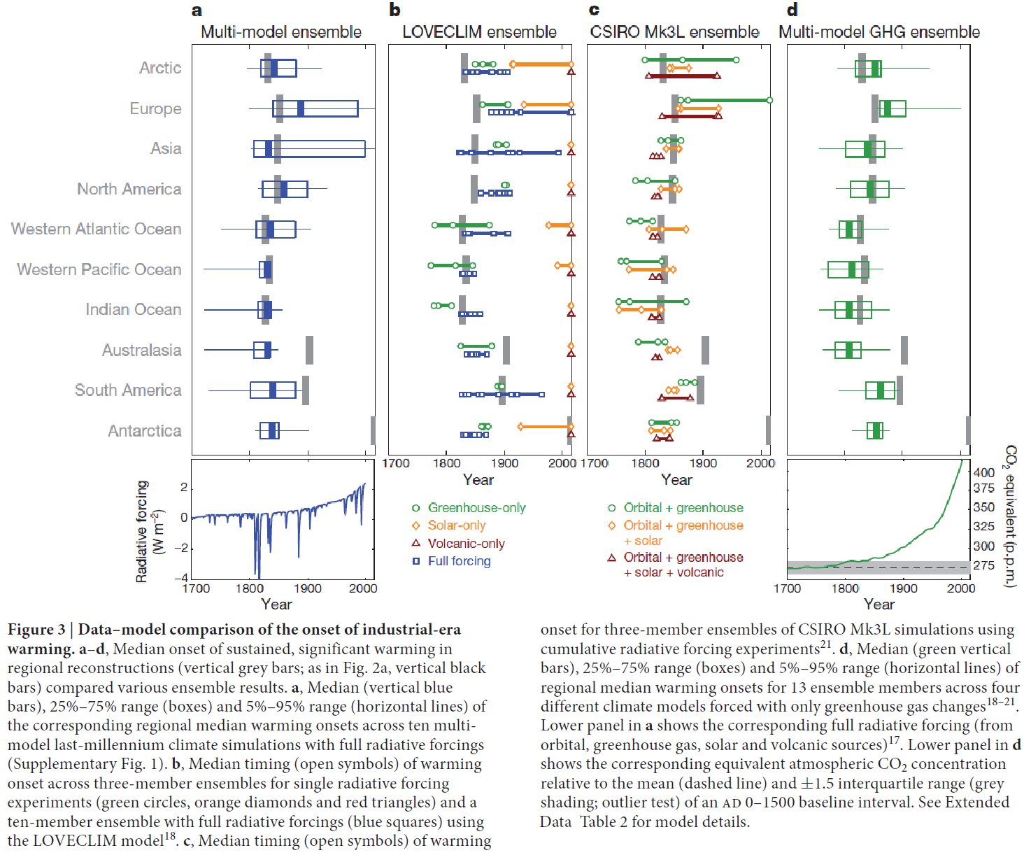 The paper’s conclusions about an anthropogenic origin of the early warming onset are based on evidence summarised in their Figure 3, reproduced here as Figure 1.