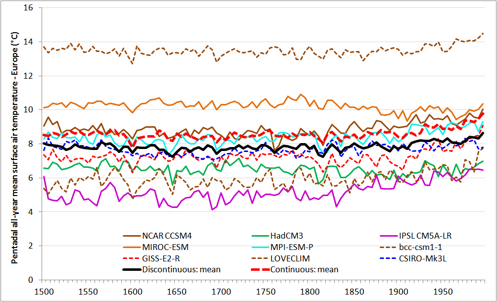 Although difficult to see in the figure, the mean of the discontinuous models shows a jump from the 1840-49 average to the 1850–55 average temperature, of 0.23°C. By contrast, the mean for the continuous models shows an increase of only 0.05°C. I have chosen these periods as they are the longest ones straddling the start of 1850 transition from the last millennium simulations to the 1850–2005 ones that are unaffected by contemporaneous or very recent volcanic activity. Repeating the exercise for temperatures in Asia and North America, where the warming onsets dates diagnosed from the simulations straddled the 1840s, showed a mean excess for the discontinuous models, in the difference between the mean 1840-49 and 1850–55 averages, of 0.17°C, similar to that for Europe.[x] The much larger increase for the discontinuous models between the mean temperatures for these periods very much supports my argument that their historical simulations started from a warmer state than their past1000 simulations ended in.