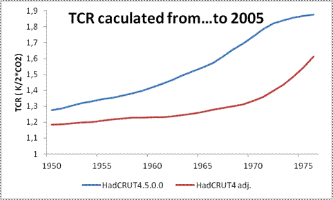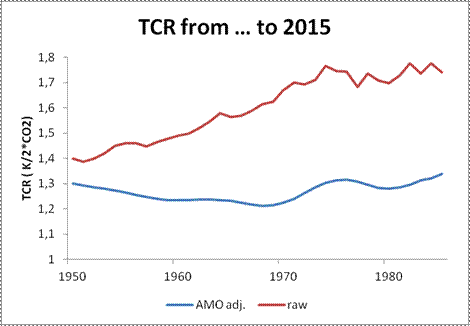 Note in Fig.3 that the TCR of the adjusted record is relatively flat till around 1970 in contrast to the unadjusted record. For the S.17- adjusted record of HADCRUT4.5 the TCR from 1970 to 2005 is 1.33 K. For the unadjusted HADCRUT4.5 this value is 1.74 K. The reduction is due to the internal variability of the oceans as it was calculated in S 17. The relative difference of the TCR values: