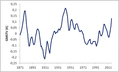 Fig. 5: The unforced variability of the GMST (GMSTV) filtered with a 10a-Loess smoother. One can