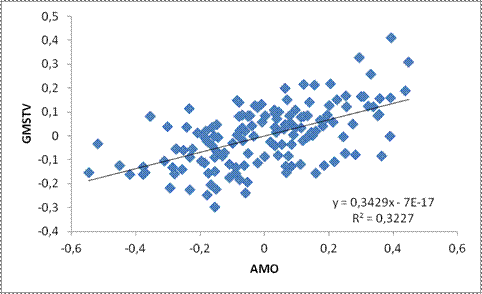 Fig. 6: The relationship between the GMSTV and the AMO with annual unsmoothed data.