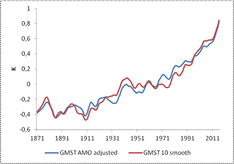 Fig. 7: The raw- and AMO-adjusted GMST filtered with a 10a Loess smoother. Note that the longtime trend is not influenced and that the adjustments produce only a difference of about 0.1K at maximum. The often discussed “hiatus” vanished.