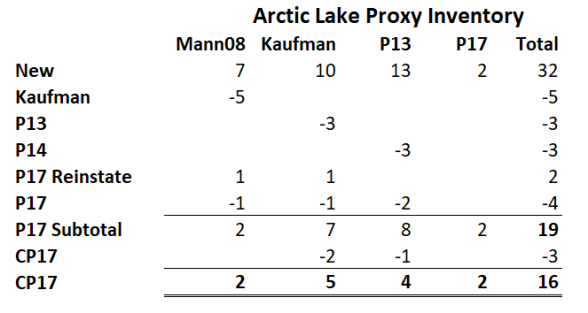Your table “Arctic Lake Proxy Inventory” has an error on the bottom row (CP17). It should read across: