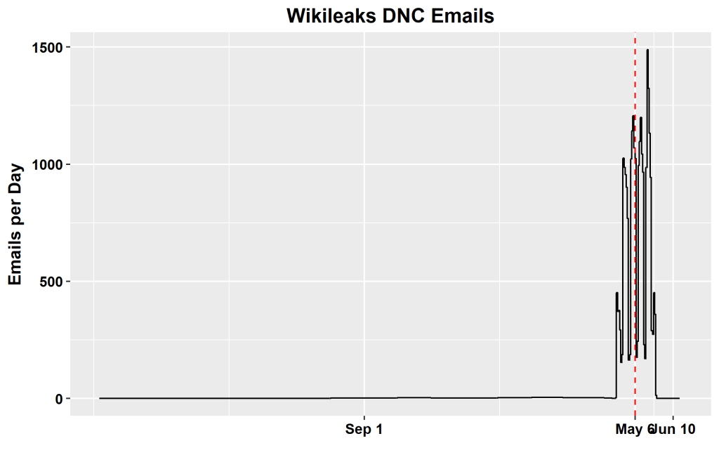 There are only a couple of emails per month (~1/day) through 2015 and up to April 18, 2016. Nearly all of these early emails were non-confidential emails involving DNCPress or innocuous emails to/from Jordan Kaplan of the DNC. There is a sudden change on April 19, 2016 when 425 emails in the archive. This is also the first day on which emails from hillaryclinton.com occur in the archive – a point that is undiscussed, but relevant given the ongoing controversy about security of the Clinton server (the current version of which was never examined by the FBI)The following week, the number of daily emails in the archive exceeded 1000, reaching a maximum daily rate of nearly 1500 in the third week of May. There is a pronounced weekly cycle to the archive (quieter on the week-ends).