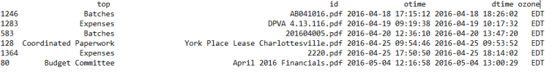 I then extracted the directory modification time (as a POSIXct object) for each document using the R-function file.info. This enables a separate extraction of timezone. The timezone for all documents was shown as EDT and/or EST even when I set the computer to UTC. I’m not sure whether this is an artifact of my usual computer setting (Eastern) or whether it is additional evidence that G2 operated in Eastern time (evidence of which has been presented previously by Forensicator and myself.) Someone may be able to shed light on this for me.
