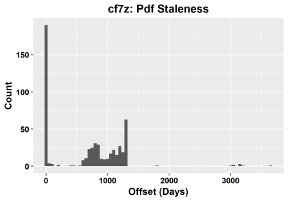 The next graph shows the number of days between document modification date and 7z modification date for these 530 pdf documents. The “stale” documents are typically 3-4 years old (with some nearly 10 years old). There are nearly 200 pdf documents with less than 50 days between document and 7z modifications, including 122 documents in which modification dates are identical.