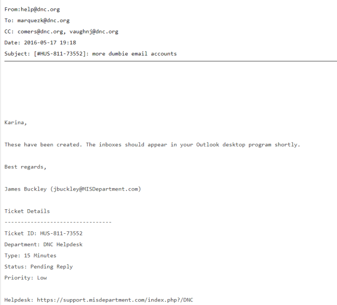 On May 17, a response from the IT helpdesk shows that the DNC was using (Microsoft) Outlook for email – not Google Apps Gmail.