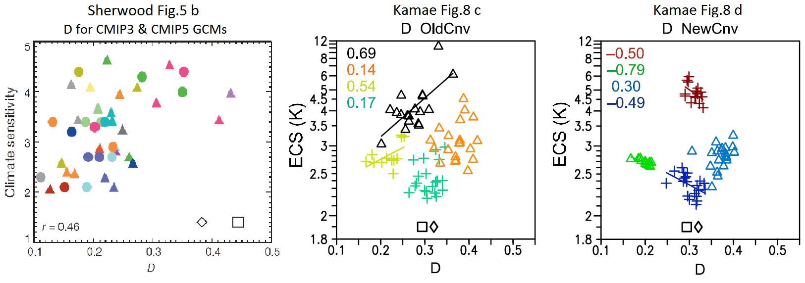 While only two of the models that Sherwood studied (both with higher than average ECS) have D values that are consistent with the reanalysis-based values, three of Kamae’s model-variants have, for some parameter values, D values consistent with the reanalysis-derived values. These D-value consistent cases have widely varying ECS values, many of them being between 2.1°C and 3°C. Moreover, the sign of the relationship between D and ECS varies between the model variants, being positive for five and negative for three. If one were to add the Kamae data to Sherwood et al.’s data the implications for ECS of the Sherwood D constraint would be very different.