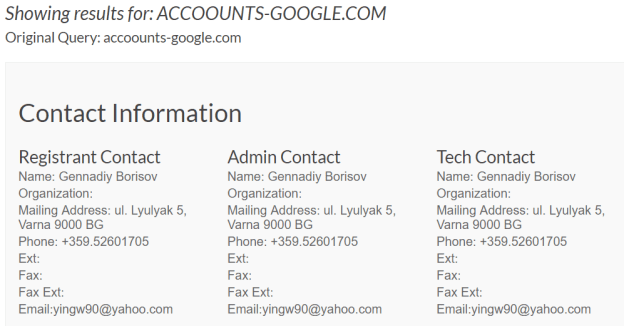 However, registrant and registrant email address for the other phishing domain accoounts-google.com leads in a different and unexpected direction. A standard Whois lookup for at whois.icann.org yielded registrant Gennadiy Borisov in Varna, Bulgaria, together with registrant email of yingw90@yahoo.com, screenshot reproduced below.