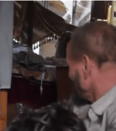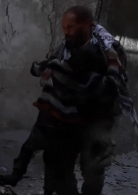 A balding man with brownish beard, dressed in khaki and wearing boots, can be indistinctly seen over the dead boy beside the upside down table. Blogger ilmastotiede/ilmasblogi plausibly identifed the balding man in khaki in this scene with the grieving balding man in khaki in the Abdullah al-Doumani and Halab TV videos. (He made another surprising identication of the balding man in khaki in the SMART Agency video discussed below.)