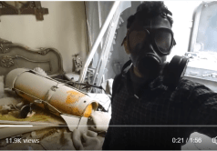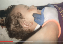 Narrator (Yaser?) was intent to show the eyes of the dead, prying them open and declaiming to the camera. However, rather than the pupils being contracted to pinpricks, the distinct characteristic of poisoning by sarin and other nerve agents, they are dilated. If anything, these images contradict theories of death by nerve agent, thus leaving unanswered the underlying question of why people didn’t simply walk downstairs away from any chlorine.
