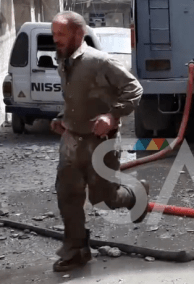 At minute 1:47, one of the White Helmets – a balding man with brownish hair and beard, dressed in a khaki shirt and pants with greenish undershirt, with loose boots, jogged back to the building. Ilmastotiede has plausibly identified this man as the identical-looking White Helmet who had carried out the boy in the grey-black striped shirt (at left) – having removed his camouflage jacket and tasseled scarf in the meantime.