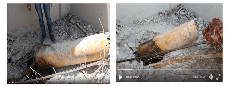 They entered a third floor bedroom directly underneath a balcony on the north side of the building. There is a hole in the top of this bedroom, through which the team observed something bright and white against the hard black background of the night sky and the illumination of the hole in the roof. When they saw this bright white light/object, the team quickly beat a retreat downstairs, pausing only briefly to peek into the first floor apartment. Two days later (and after the inspection of the building by the Russians on April 9), Eliot Higgins of Bellingcat published a picture showing an approximately 40-liter yellow cylinder of the type commonly used as a chlorine container in the location where the white light/object had been observed in the earlier video. Kline argued that this was frost from escaping chlorine.