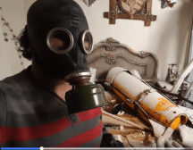 which included a scene in which a male nurse (one of the later interviewees who described the incident as a White Helmets stunt) gave a puffer to an asthmatic baby in the same location and procedure as he did with a similarly aged baby in a Douma Revolution video. This video included a scene which, for some reason, was not included in the Douma Revolution videos. In it, a fierce-looking man with black head band and mask brandished a terrified baby over his head.