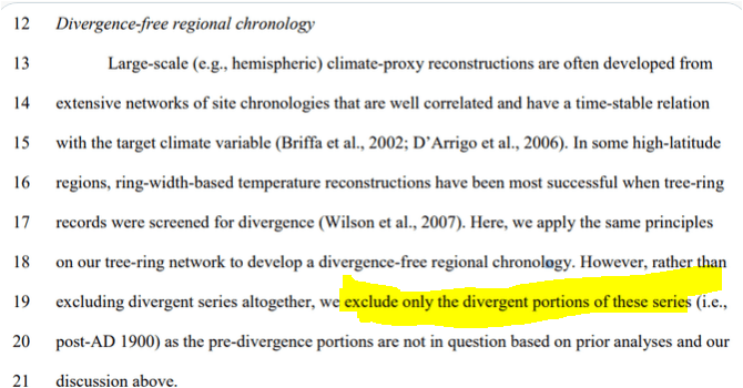They took “hide the decline” to extremes that had never been contemplated by prior practitioners of this dark art. Rather than hiding the decline in the final product, they did so for individual trees: as explained in the underlying article, they excluded the “divergent portions” of individual trees that had temerity to have decreasing growth in recent years. Even Briffa would never have contemplated such woke radical measures.