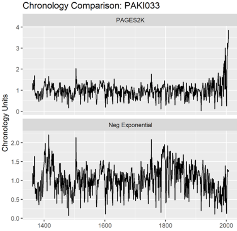 The tree ring series in this sample are rather short; the screening procedures have somewhat concentrated series with slight upticks. (The stripbark bristlecone chronologies that were so prominent in the Mann et al Hockey Stick continue to be used in PAGES2019 – as discussed below.) I discussed the series in the left column with large uptick (Asi_MUSPIG aka paki033) in a 2019 tweet thread here. I located the underlying ring width measurements at NOAA and re-calculated the tree ring “chronology” using standard methodology – see below. The high-frequency details match, showing that the underlying measurement data is apples-to-apples. No chronology from original authors is archived at NOAA: so how did PAGES2K manage to get such a hockey stick? I have no idea.