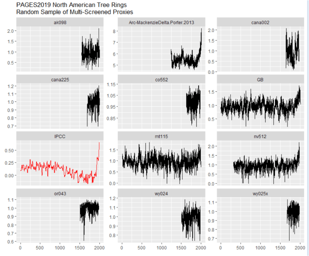In order to give readers an overview of the underlying data – not the massaged final product, I’ve plotted three batches of 11 randomly selected series from each of PAGES2017, PAGES2019 and then PAGES2019 North American tree rings and then commented on each batch. (The samples were selected by R formula sample(1:K, 11) where K is the size of dataset being sampled.) In each case, there were usually series that I had already studied plus numerous non-descript series, which are notable and important to show precisely because the majority of proxies are non-descript and you need to see this to understand it.