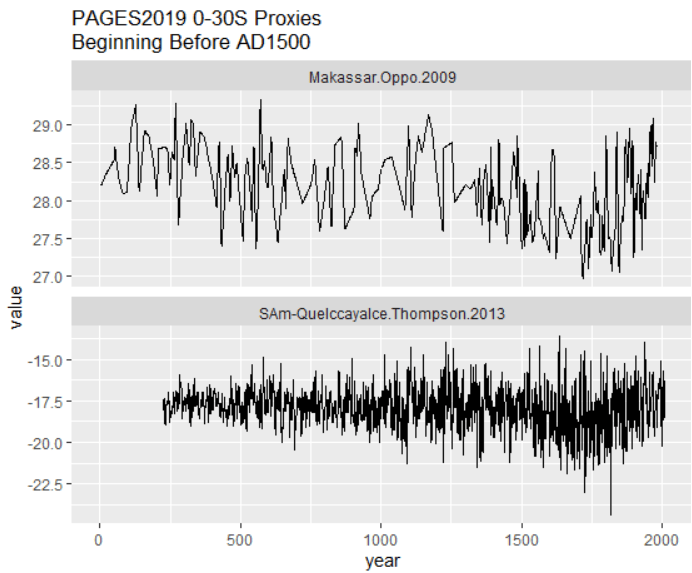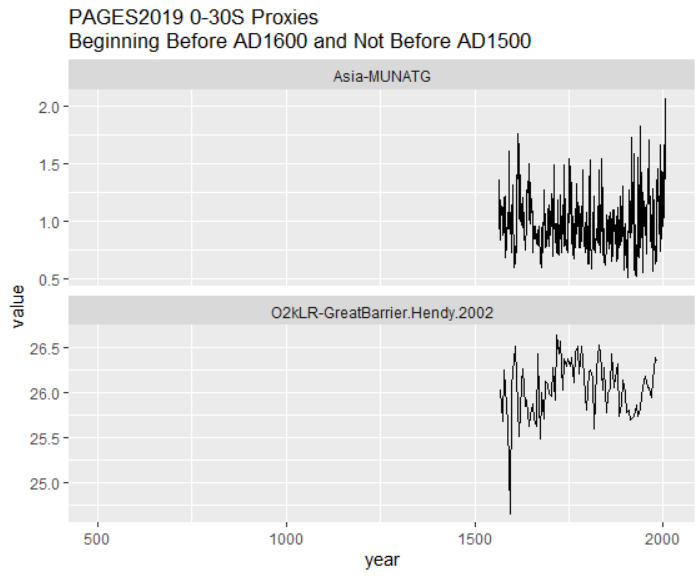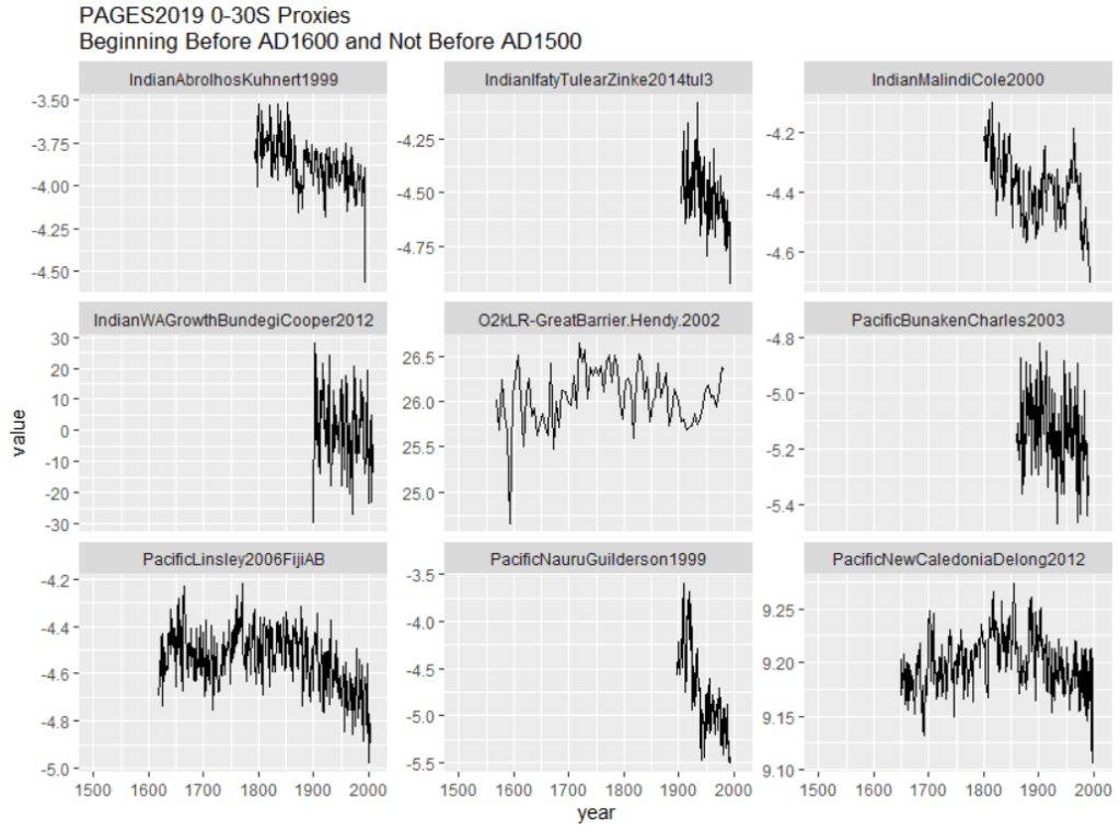 Indeed, there are only two other 0-30S proxies that begin prior to AD1600: the Hendy (2002) Great Barrier Reef temperature reconstruction that does not have a HS; an Indonesian tree ring series (INDO0005) that is non-descript in the underlying measurement (rwl) data at NOAA, but which, according to a thus far undisclosed calculation, closes on a late spike – like numerous other sites in the PAGES2K Asia tree ring calculations. I’ve sought information on this chronology from the lead authors of PAGES2K 2019 but they don’t know and have refused to bother finding out.