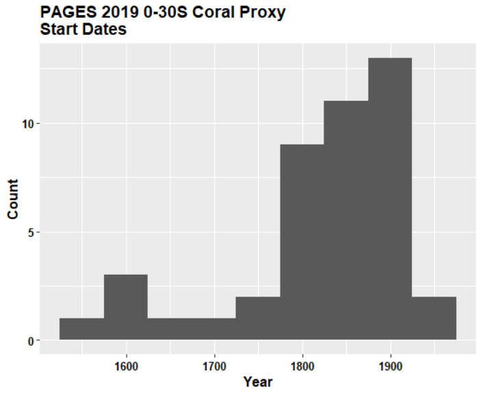 The rest of the 0-30S network consists of 42(!) short and micro-short coral series. Below is a histogram of start dates for the 43 (including Hendy GBR) coral proxies. Half of them start after AD1850 and no less than 30% after AD1890. One series (Clipperton Atoll, Wu [2014]) begins in AD1942 !?! None of these short series shed any light on whether the medieval period, for example, was warmer than modern period or not.