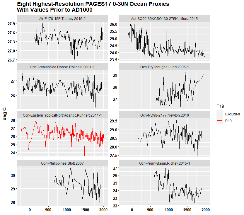 The single long proxy with values through the first millennium is a temperature reconstruction from Mg/Ca values from an ocean core offshore northern Africa. Its values decline erratically through the past two millenia, with very minor recovery in 20th century. If this is the ONLY data for the 0-30N latband through most of the first millennium, how can PAGES2K say with any confidence that modern values are higher than first millennium values? They can’t. My guess is that their algorithm(s) somehow paste 20th century trends in coral d18O onto non-descript or declining long proxies, but that is, at present, just a surmise. All one can say for sure is that, based on the PAGES2019 0-30N proxy network, it’s impossible to assert that modern temperatures in this latband exceed first millennium values (or vice versa.)
