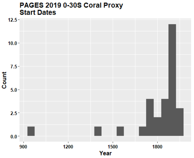 First and foremost, notice the “rise of corals” in successive PAGES versions, even though they are extremely short. As a proportion of the network, corals went from 1.7%, 1 of 57 proxies in the PAGES13 network, to 71% of the PAGES2019 network (29 of 41). All except three of these coral series begin after 1775, with many not beginning until the late 19th or even 20th centuries. The one coral series beginning before AD1000 is intermittent. (It is from Palmyra Island, located on a very narrow portion of the ITCZ in the eastern Pacific and may well be a rainfall proxy – see earlier CA discussion here.