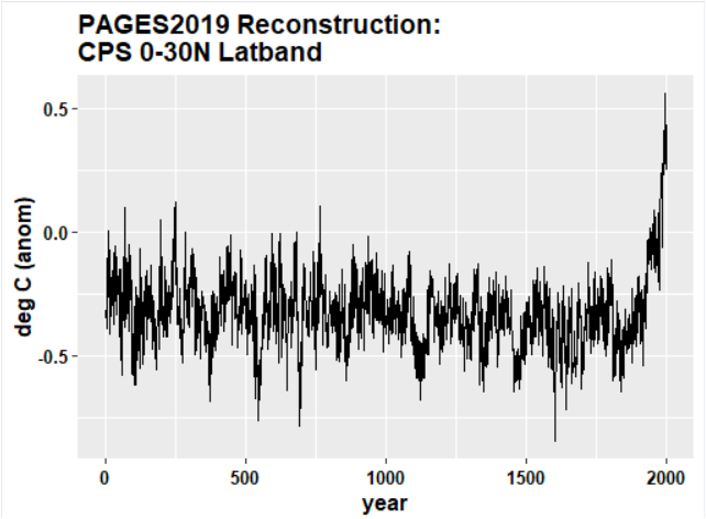 the PAGES group published latband averages for TEMP12K. For PAGES2K, they published reconstructions for all gridcells. I averaged their gridcell values in 0-30N latband for their CPS reconstruction. Absolutely routine calculation from their data. If they feel confident enough to produce reconstructions for individual gridcells, it’s entirely reasonable to look at latband averages. To be precise, their purported calculation at level of individual gridcell is really stupid overreach. I have no idea how they purported to do that.