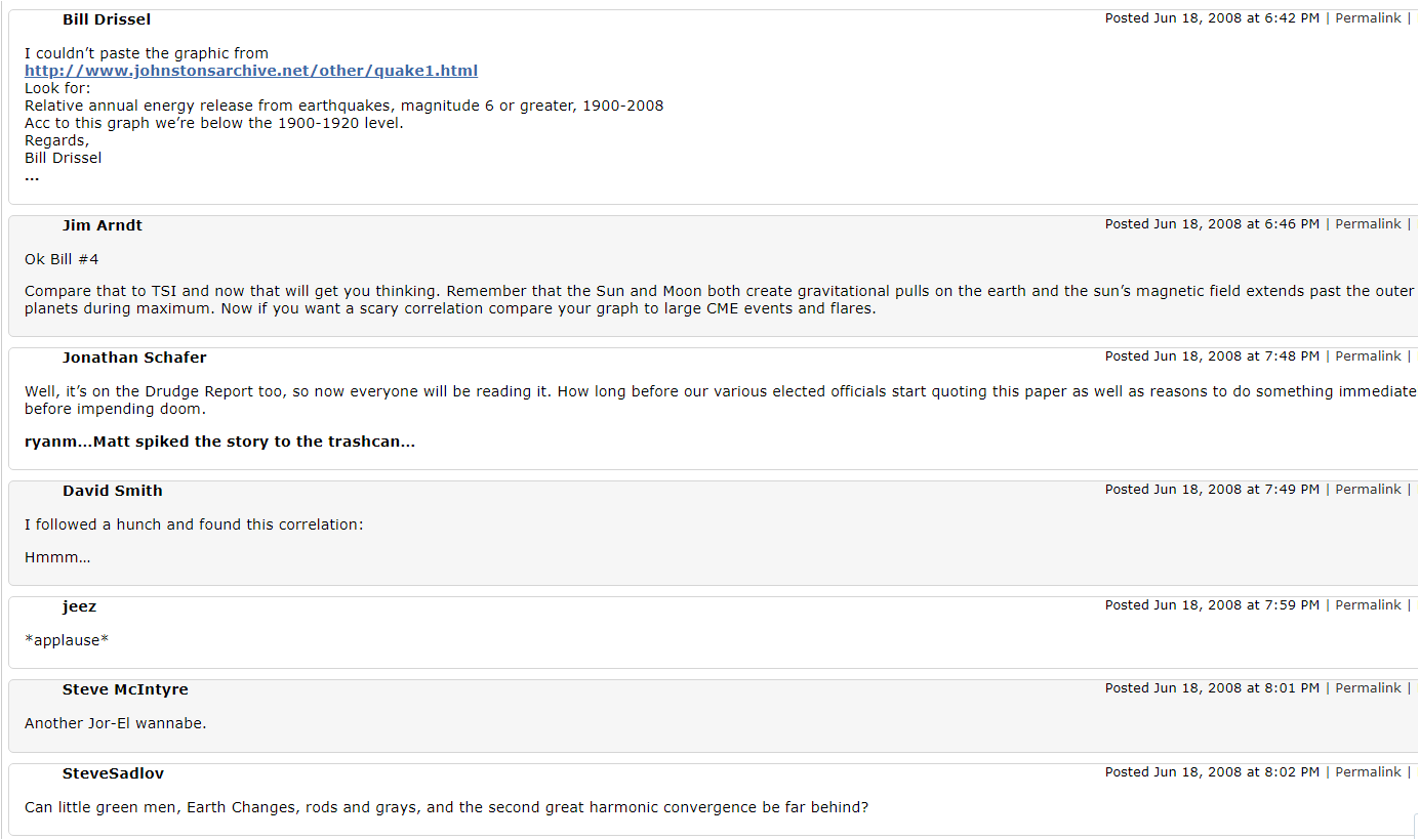 In June 2008, Climate Audit contributor Roman Mureika, a retired professor of statistics, published an article at Climate Audit, that snickered at the latest global warming scare, that was then being promulgated in risible articles by CBS News, Associated Press and others, based on a crank article by a Thomas Chalko, that warned that global warming was increasing the “destructive ability of earthquakes”: