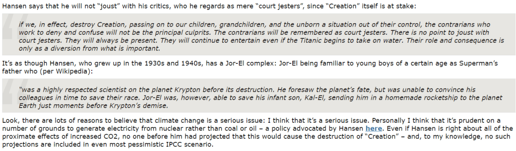 The term “Jor-El wannabe” was an allusion to a Climate Audit article the previous year entitled Hansen and the Destruction of Creation, commenting on a jeremiad by climate scientist James Hansen, who had been embarrassed by my discovery that NASA GISS had made a stupid programming error in their recent data in which 1934 had been demoted as the warmest year in US instrumental records and that, when the error was corrected, it was once again the warmest year. Rather than conceding the error and acknowledging the criticism, Hansen went into a tirade about the “destruction of Creation” – a tirade so bizarre that I satirically proposed that Hansen had a “Jor El complex” (referring to destruction of Krypton in Superman comics):