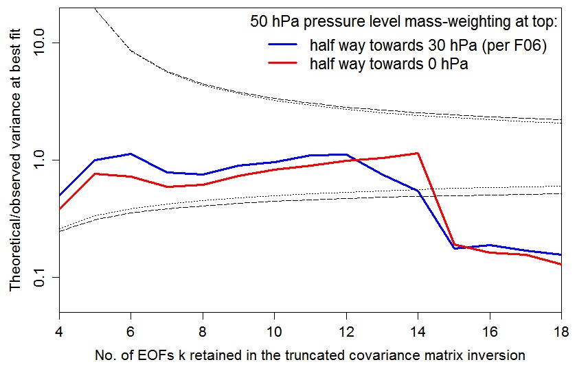 My concern in this article is with the F06 upper air (ua) diagnostic. F06 weighted the upper air diagnostic variables by the mass of air attributable to each, which is proportional to the cosine of its mean latitude multiplied by the pressure band allocated to the relevant pressure level. The weighting used only affects the EOF patterns; without EOF truncation it would have no effect. It seems reasonable that each pressure level’s pressure band should be treated as extending halfway towards the adjacent pressure levels, and to surface pressure (~1000 hPa) at the bottom. But where to treat the top end of the pressure band attributable to the highest, 50 hPa pressure level, as being is less clear. One choice is halfway towards the top of the atmosphere (0 hPa). Another is halfway towards 30 hPa, on the grounds that data for the 30 hPa level exists – although it was excluded from the main observational dataset due to excessive missing data. The F06 weighting was halfway towards 30 hPa. The weighting difference is minor: 4.0% for the 50 hPa layer on the F06 weighting, 5.6% on the alternative weighting.
