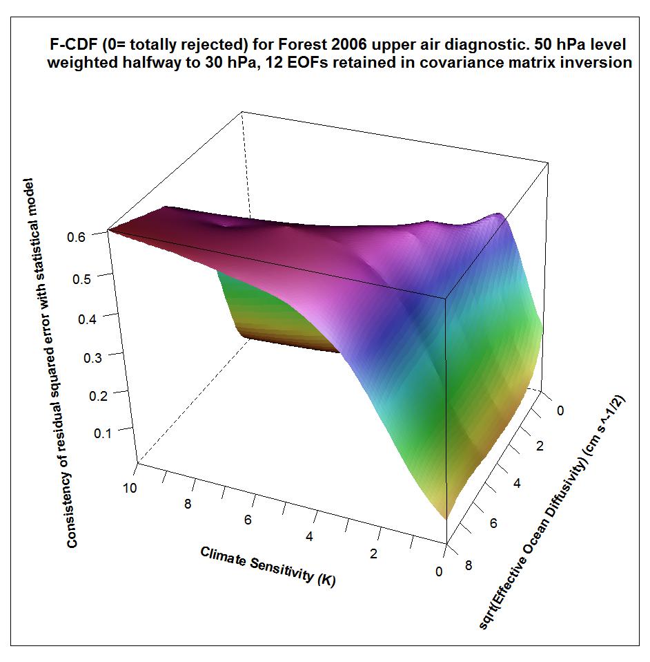 Notice that the combination of high climate sensitivity but fairly low ocean diffusivity is effectively ruled out by the kua = 12 likelihood surface, but not by the kua = 14 surface nor (except somewhere below sqrt(Kv) = 2) by the kua = 13 surface. It is the combination of high climate sensitivity but moderately low ocean diffusivity that the F06 surface and deep ocean diagnostics, acting together, have difficulty well-constraining. So the failure of the upper air diagnostic to do so either fattens the upper tail of the climate sensitivity PDF.